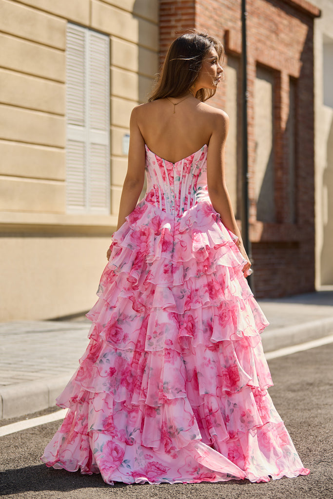 A Line Sweetheart Pink Floral Chiffon Tiered Prom Dress with Slit VL25122106